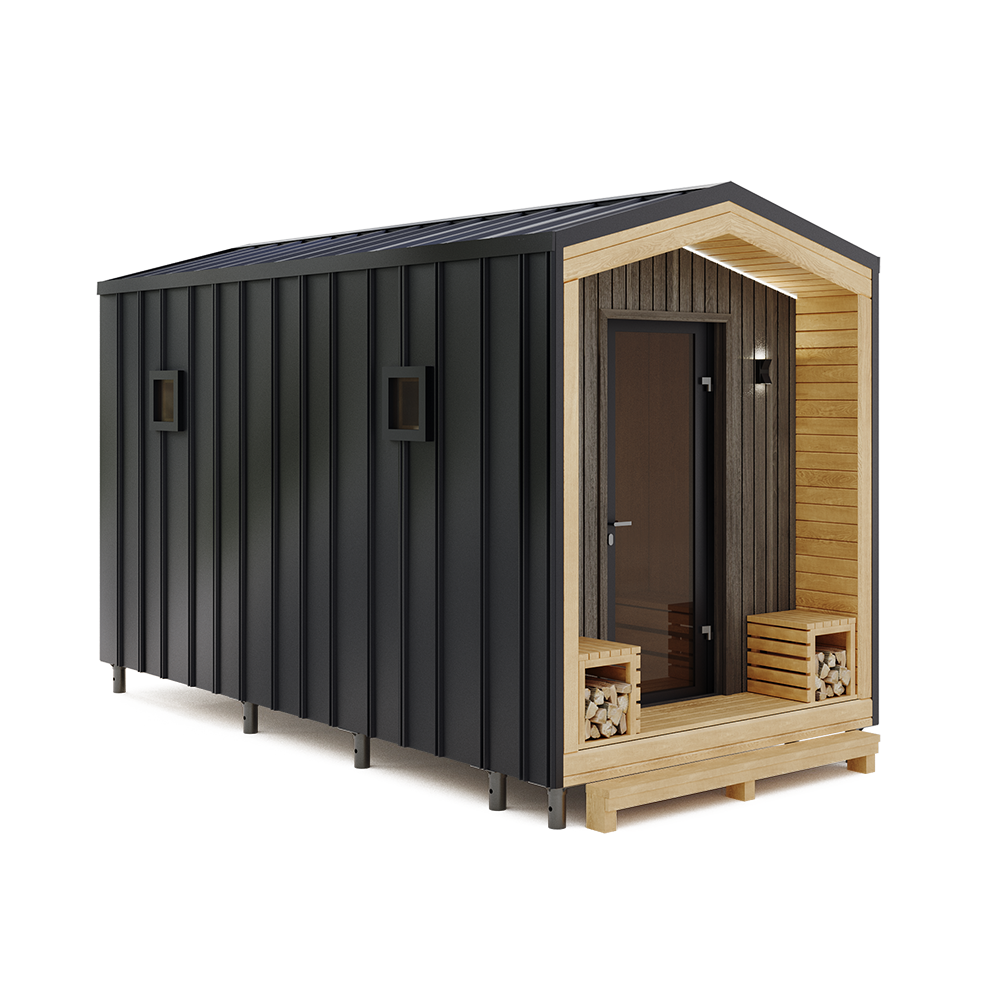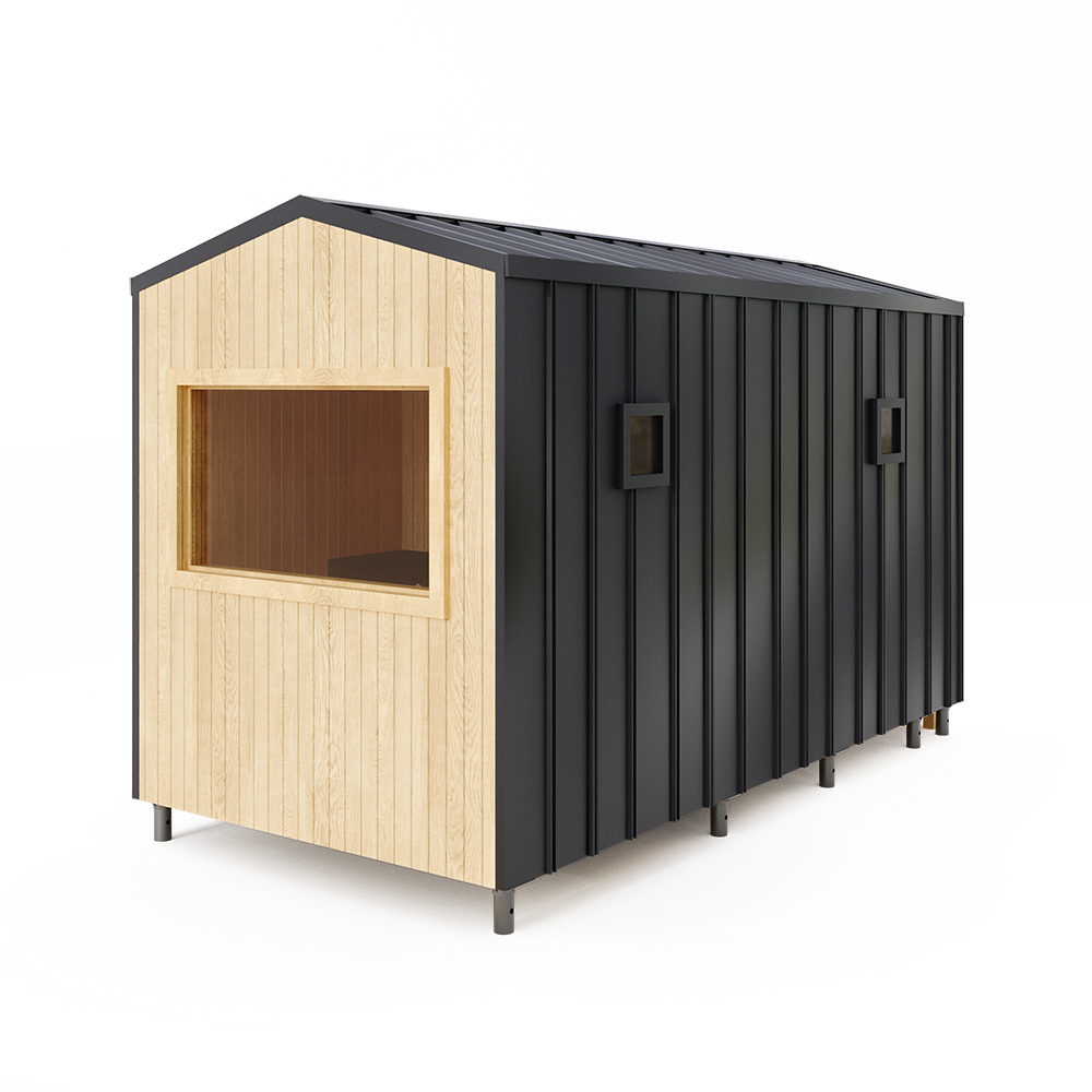 Баня Tetris 3A (MHB7007) — модульная баня 2,45×4,96 м с фальцевым профлистом, террасой и выбором печи | Доставка по Беларуси