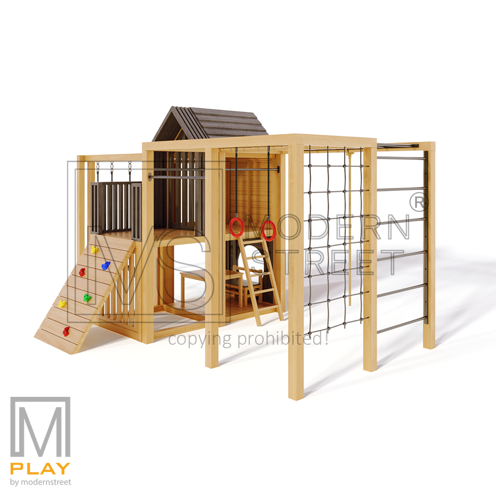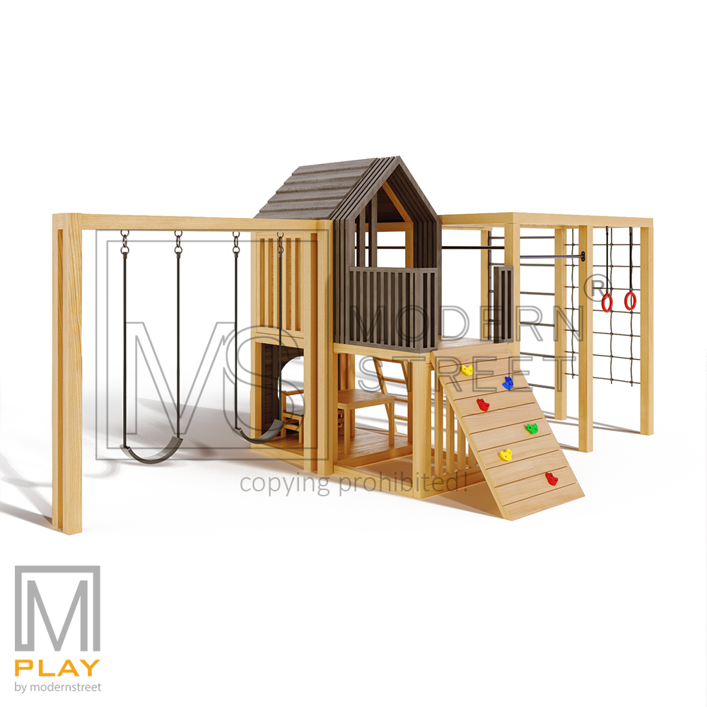 Детская игровая площадка Modul 20 (14121) — трёхмодульный домик с террасой, песочницей, качелями и воркаут-зоной из клееного бруса